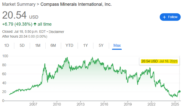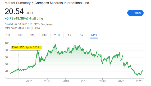 Investing is hard. Not because you can’t pick a good stock—but because holding it without a game plan can cost you years of compounding. Let me be clear: this isn’t about throwing shade at the investor in the example below. It’s a valuable lesson for all of us. The Setup Compass Minerals (NYSE: CMP) was recommended to Morningstar DividendInvestor subscribers in April 2005. The stock was praised for its durability and rising dividends—and for a while, it looked like a winner. “I recommended these shares in April 2005 and haven’t regretted it… Compass has raised its dividend twice by an average annual rate of 7.9%.” Fast forward to July 2025: the stock is trading at $20.54, nearly 20% below its 2005 price of $25.84. That’s 20 years of price stagnation—despite dividend growth along the way. What’s the Lesson? You can be right in the short term—buy a good company, watch it run—but you still have to sell to realize gains. If you don’t, the market might take them back. More importantly: